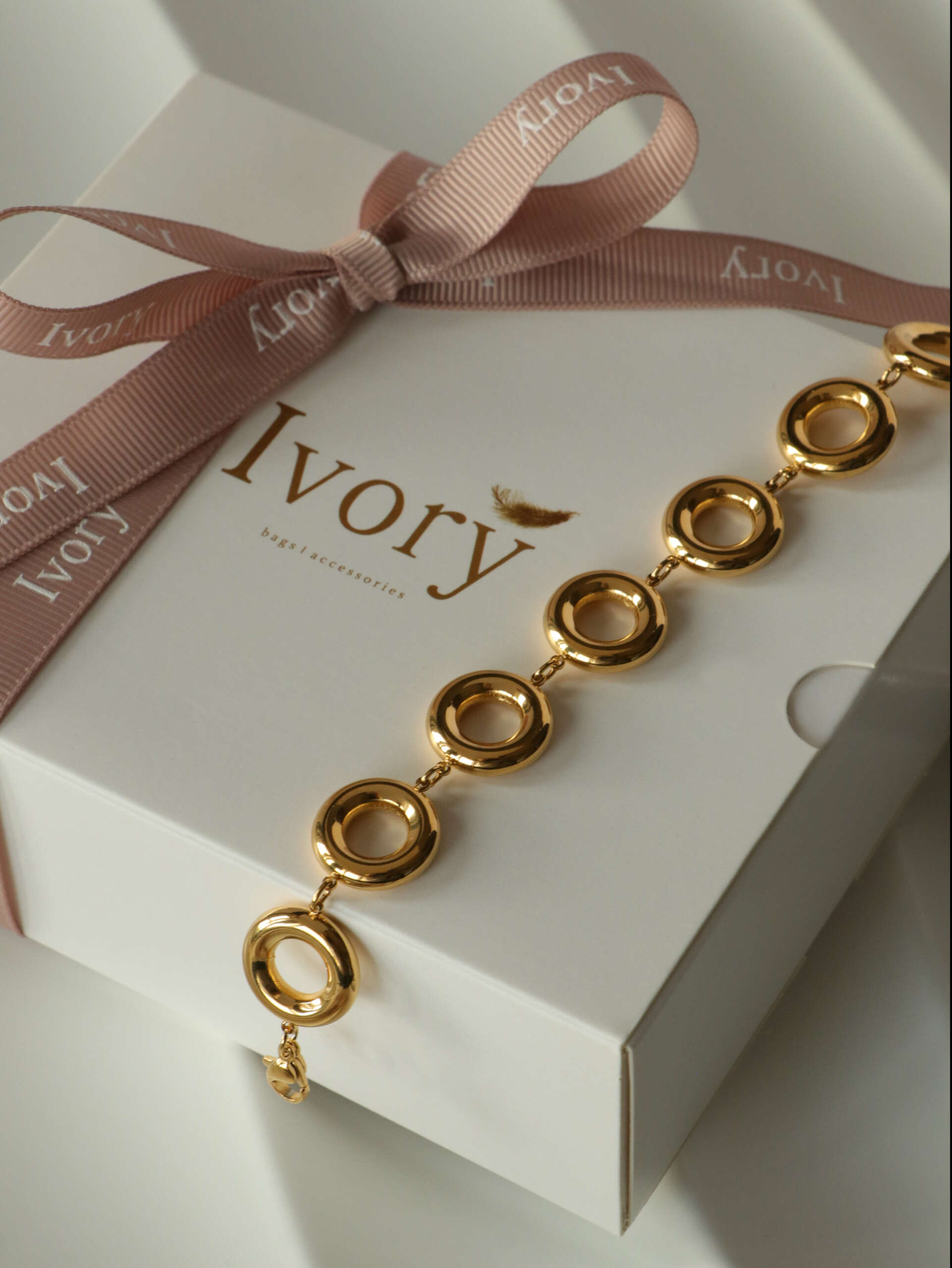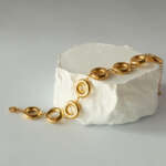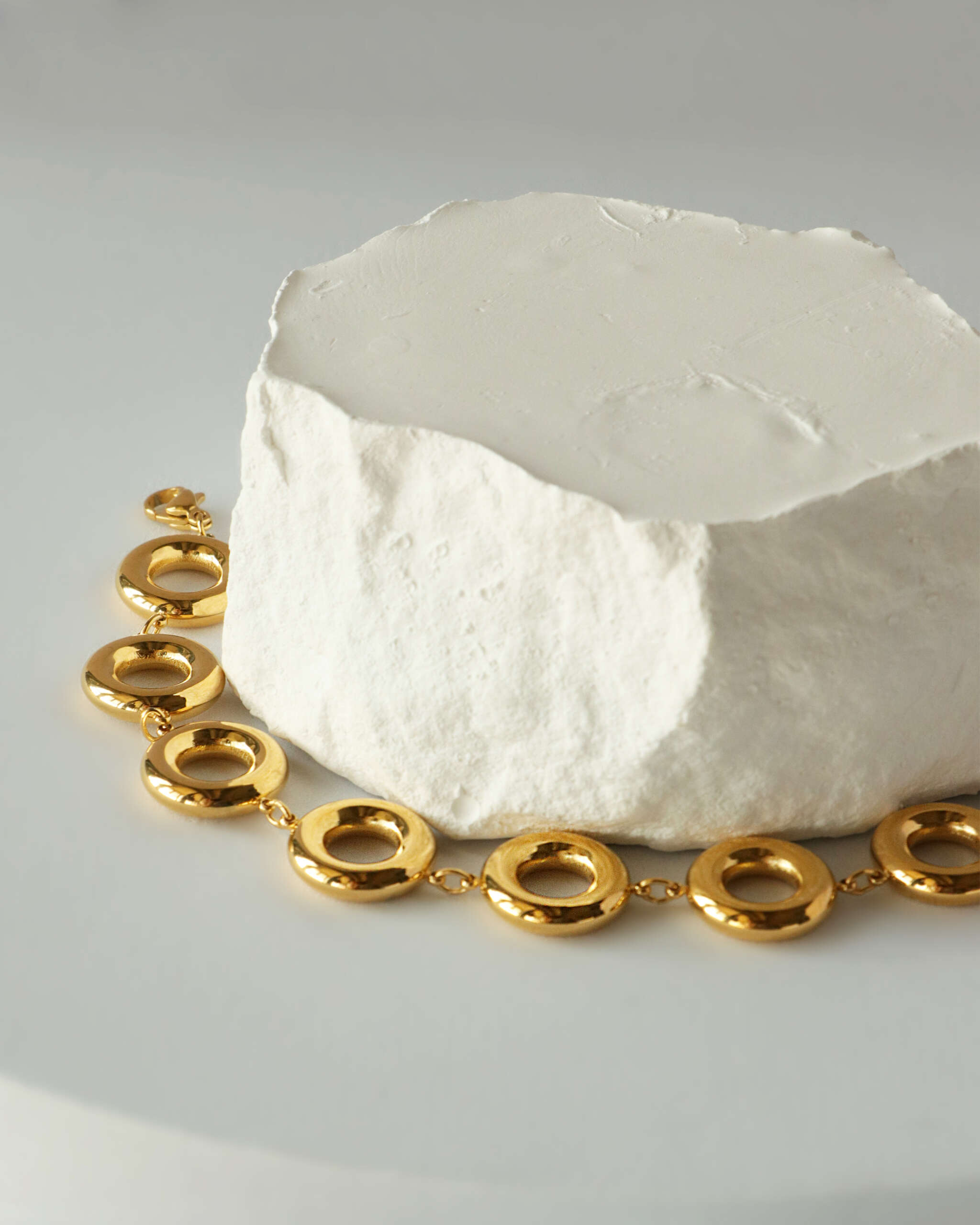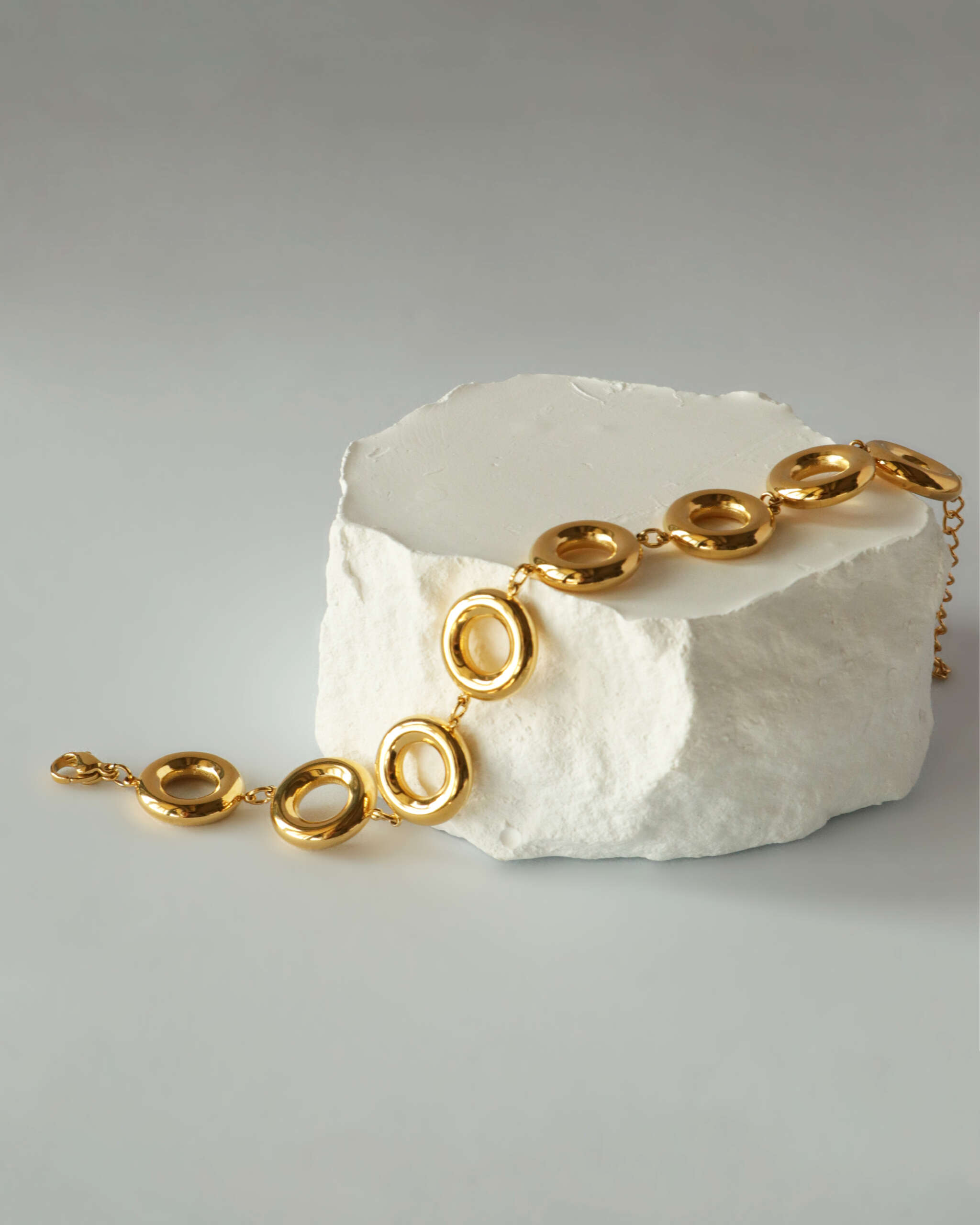 The Halo Link Bracelet combines modern design with timeless sophistication. Featuring a series of polished circular links, this bracelet creates a seamless flow of elegance around your wrist. Its adjustable clasp ensures a comfortable fit, while the radiant gold finish adds a luxurious touch. Whether paired with formal attire or casual ensembles, this bracelet effortlessly elevates your style, making it a versatile addition to any jewelry collection. Perfect for gifting or treating yourself to a touch of refinement.