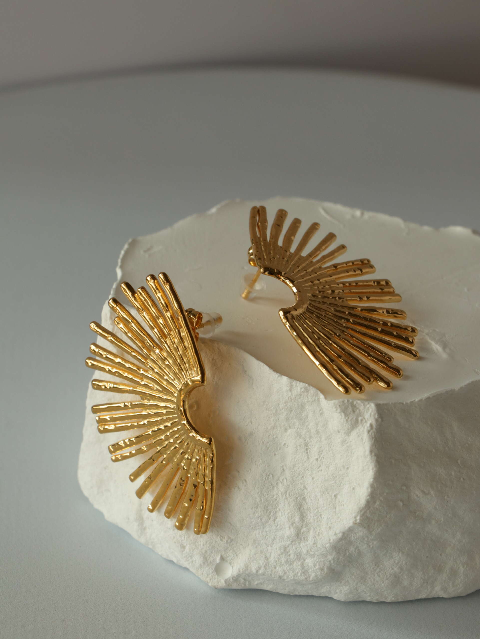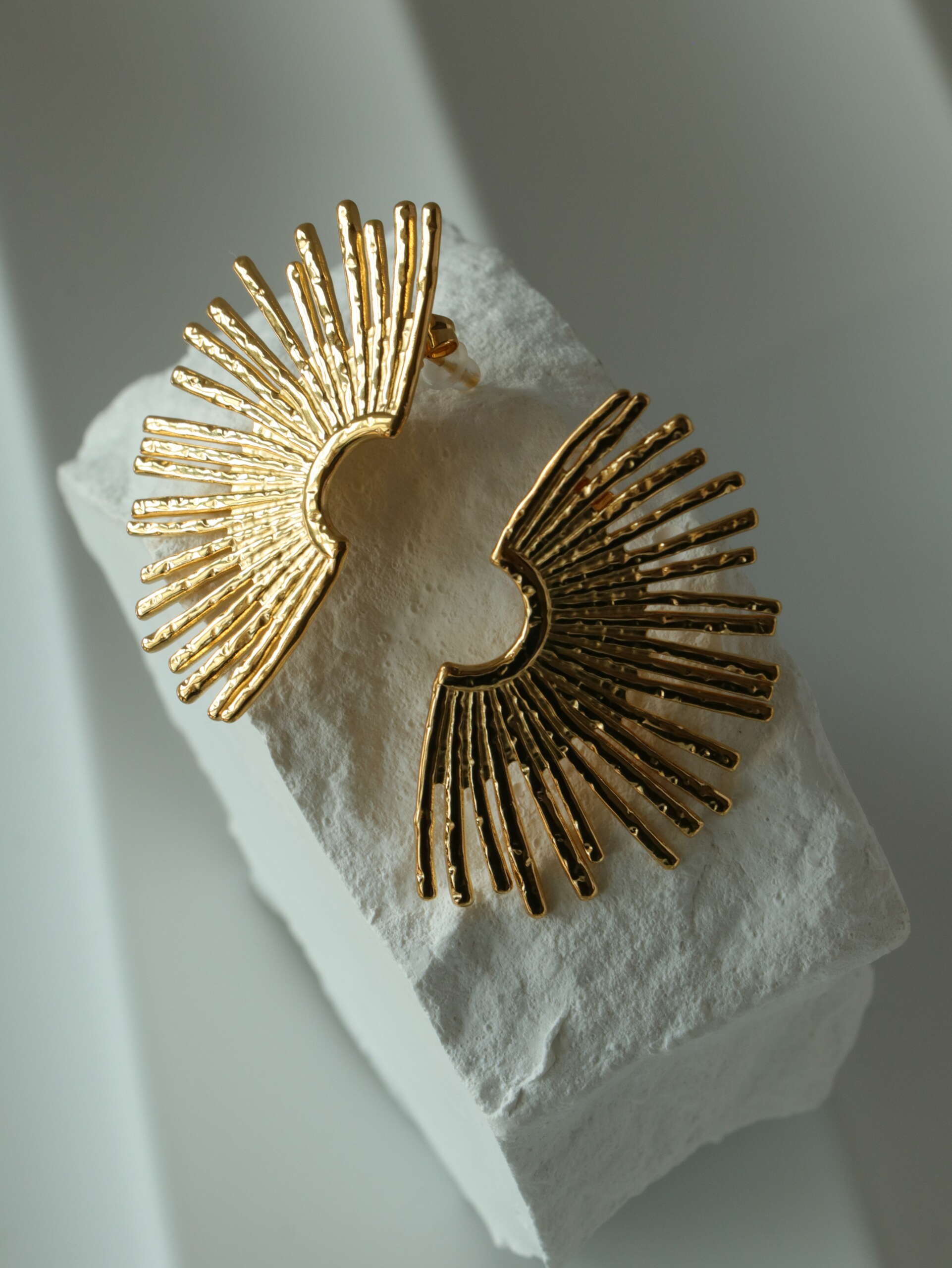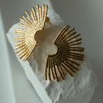 The Radiant Arc Earrings are a bold expression of contemporary elegance. Inspired by the brilliance of sunlight, these gold-tone earrings feature an intricate arc design with textured rays extending outward, creating a dynamic and eye-catching silhouette. Lightweight and versatile, they are perfect for elevating your style at any event or occasion. Make a radiant statement with these stunning earrings that embody the perfect blend of modern artistry and timeless sophistication.